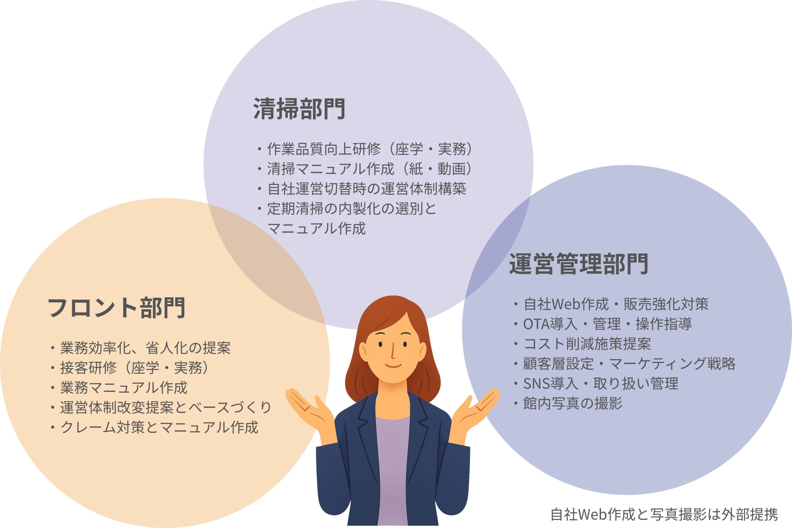 人員定着の環境づくりなど、各種のお悩み解消に向けて宿泊施設の運営を総合的にサポート
